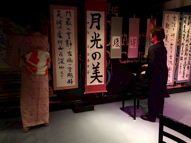On August 18, JETAA North West was invited to join Free as a Bird, the Keiboku Calligraphy School’s second exhibition and performance at the Jacaranda Club in Liverpool. The Keiboku School is a large private calligraphy school in Tokyo run by Keiko Hiraga. Keiko was warm and welcoming and she gave me a fascinating tour of some of the pieces on show. There was a wide variety of styles and texts exhibited, including Japanese poems, Chinese-style poems, sutra copies and creative pieces featuring just a few kanji (Chinese characters.) A feature piece was a stunning, simple suiboku-ga (ink and wash painting) of a hagi tree (bush clover) and the moon.