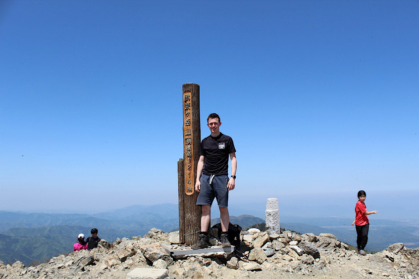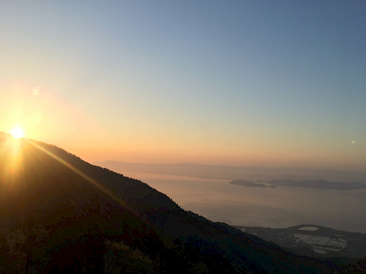 I'll choose three. I'm very outdoorsy, which is why Shiga was really good for me. It has mountains, and beautiful roads, Lake biwa is slap bang in the middle of the prefecture. On the west side there's a big mountain range called the Hira Mountains, and it really dominates the skyline in Shiga. I could see it from my house, it's huge, and it changes with the seasons. It's like hazy blue in the summer, and then obviously snow caps in the winter and becomes all orange and red in autumn. I tried to spend as much time as I could in those mountains, and I did lots of peaks individually. I think I tried to do a traverse from South to North of the Hira mountain range. It would take two days, and right in the middle, there's like this big open plain completely out of nowhere. It looks like it's a made campsite, but it's not it's just right in the middle of the mountains. We camp there, and then in the morning, we set our alarms really, really early, jumped to the nearest summit, and just looked down on Lake Biwa. We could see the sun rising behind it from the east side, and it was just stunning. Just us sat on a mountain chatting together. Seeing the sky go orange and red and blue and whatever and that's a really unforgettable memory. I've done Mount Fuji as well, but although the sunrise is amazing, you're kind of like a sardine with a million other people there, and it was just nice to enjoy that with two other people, so that was definitely one of my best memories.